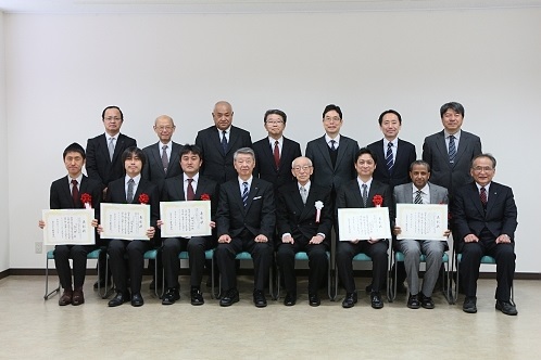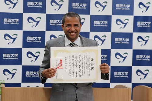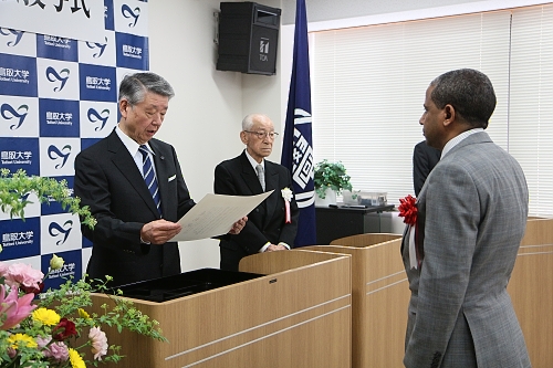 The awarding ceremony took place on Koyama campus on February 28. Dr. Nigussie received the certificate of achievement from the President of the university and the extra prize, Hinomaru Gratitude Foundation incentive, from Executive Director Nakao of the General Incorporated Foundation Hinomaru Gratitude Foundation.