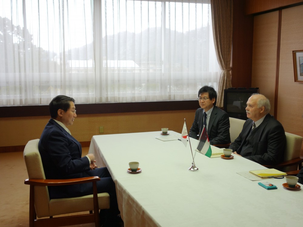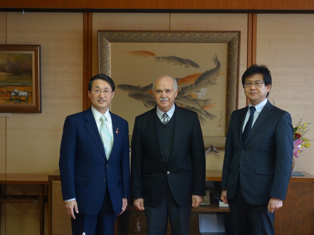The meeting started with Dr. Oweis' self-introduction to the Gov. Hirai and presentation of his plans at the Platform: “I’d like to contribute to the growth and enrichment of research and education at the Platform with my expertise and experiences to contribute to Tottori University.” Dr. Oweis also stated that he would like to contribute to the people of Tottori, although indirectly, by doing practical researches which would help solve issues in neighboring country’s dry areas that affect Tottori. To Dr. Oweis’ statements, Gov. Hirai replied saying “I am saddened with the civil wars going on in the Middle East. However, I understand that Jordan is a very safe country. Japan needs to cooperate with Jordan to support civil war resolution. I believe that research and education will be important bases in resolving the issues.” He also stated that he was happy to hear Dr. Oweis’ clear vision and plans at the Platform and he is looking forward to the further success of the Platform.