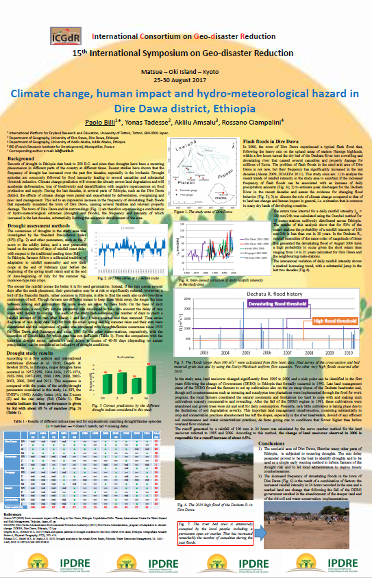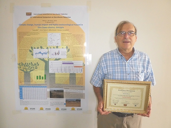 日本や中国をはじめ、イタリア、ドイツ、ベルギー、チェコなどの国々から80名程度の研究者が参加しました。Billi特命准教授は、Yonas Tadesse氏,、Aklulu Amsalu氏、Rossano Ciampalini氏と共著した「Climate change, human impact and hydro-meteorological hazard in Dire Dawa district, Ethiopia」というポスターを発表し、見事最優秀ポスター賞を受賞しました。
