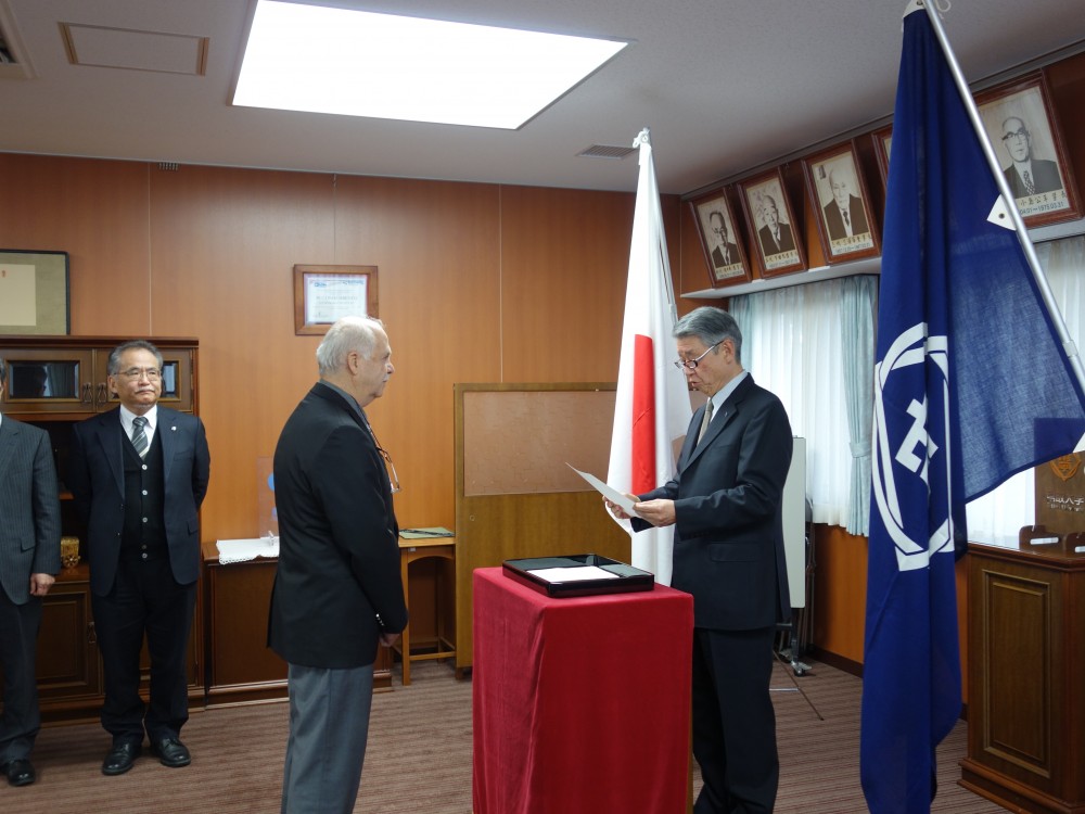 豊島学長から辞令を受ける ディーブ オゥエイス氏