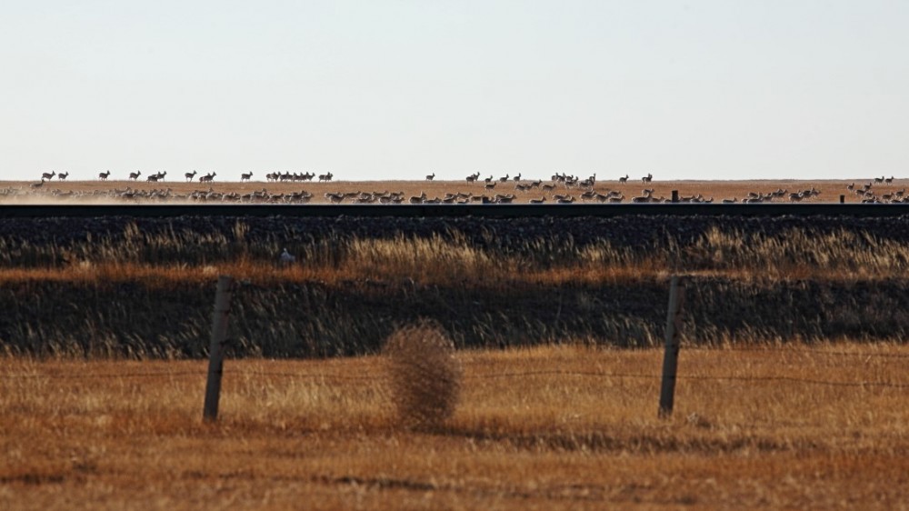 モンゴル縦断鉄道沿いを移動するモウコガゼルの群れ。